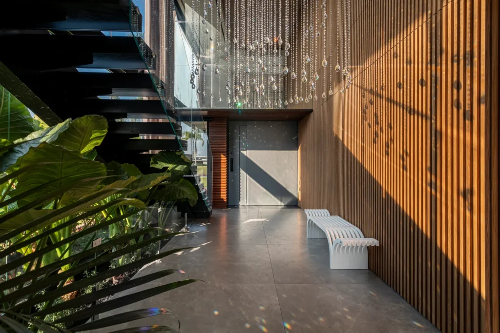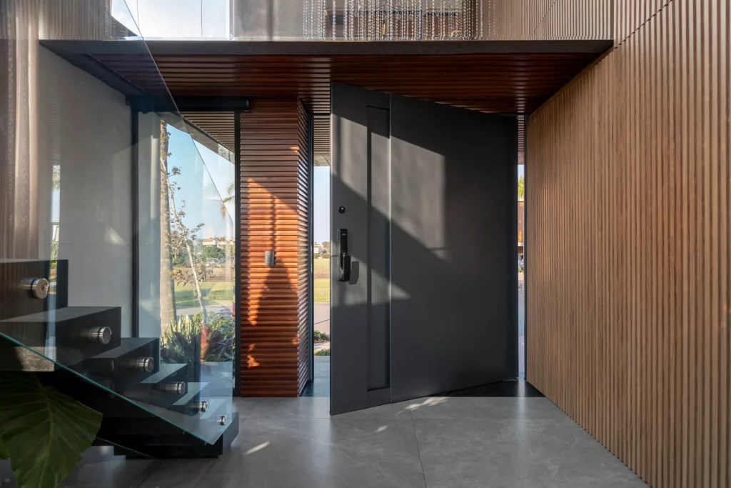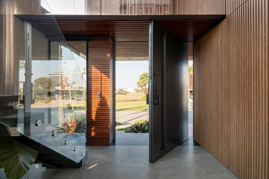 Porta Pivotante Projetta presença monumental em um gesto elegante que acolhe e protege: abertura silenciosa, acabamentos nobres e segurança discreta.