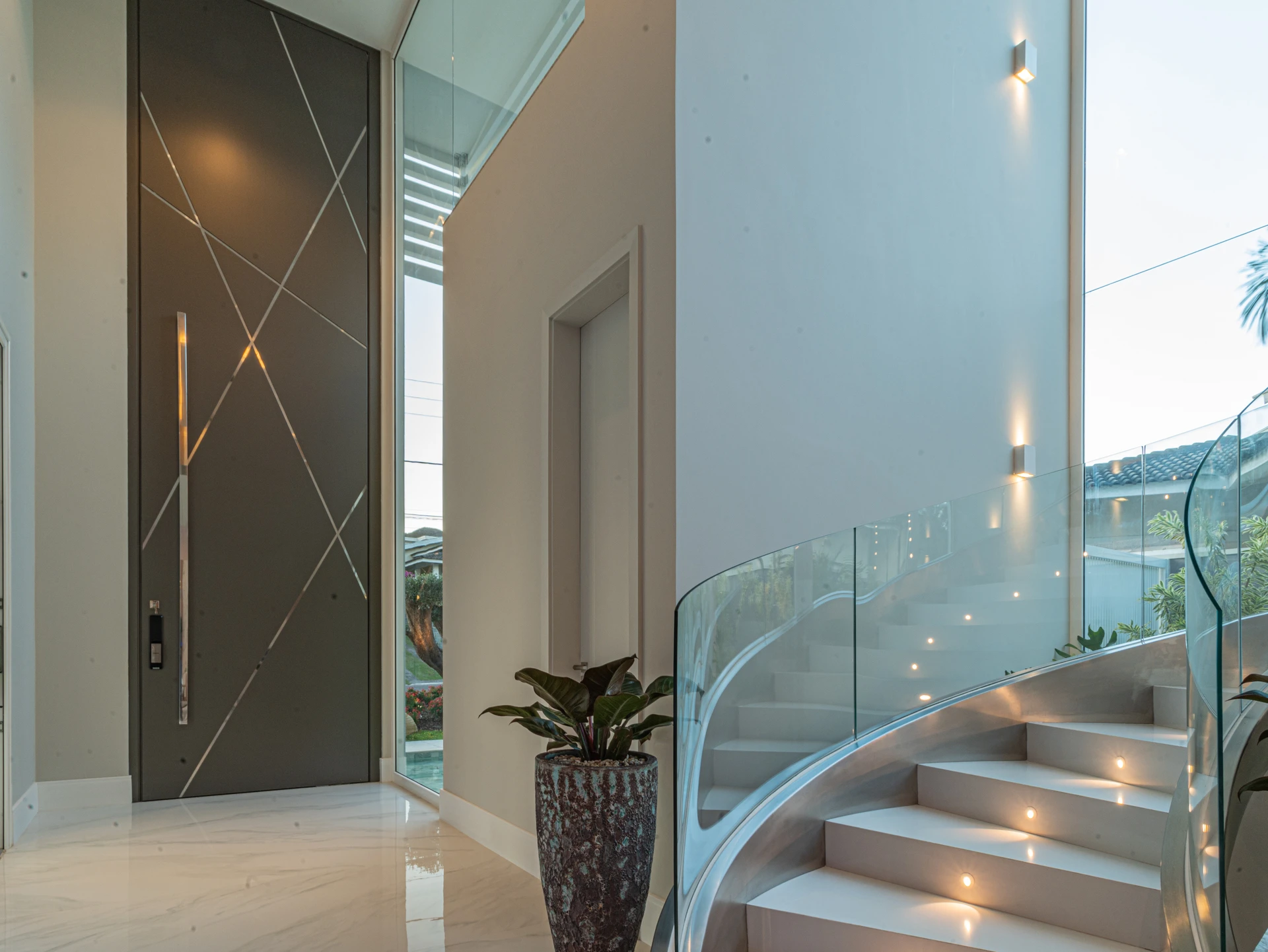 As portas pivotantes Projetta foram concebidas para transformar qualquer fachada em uma entrada grandiosa. Graças ao sistema pivotante, é possível criar vãos amplos com abertura suave e silenciosa, conferindo imponência e sofisticação ao ambiente.