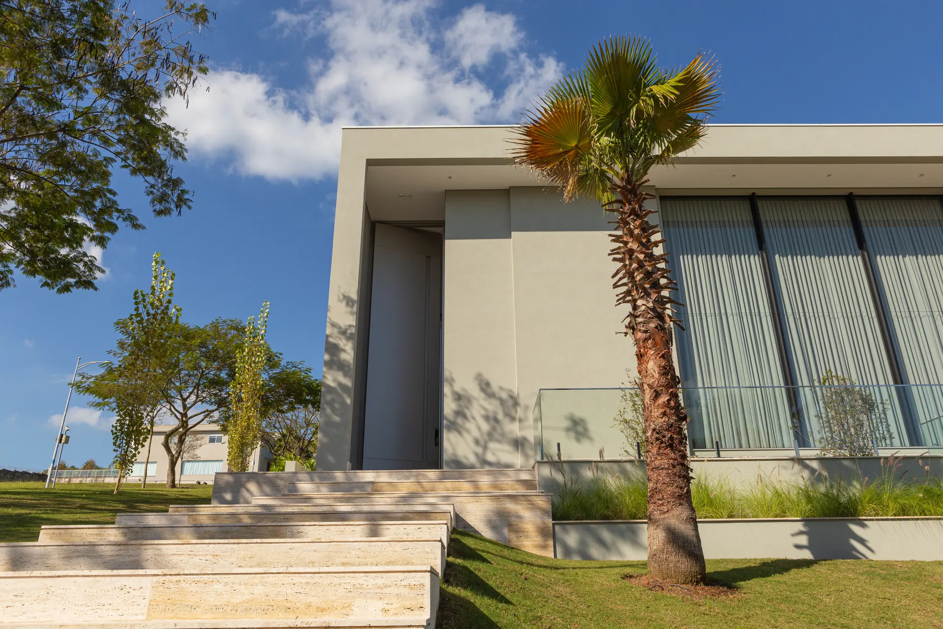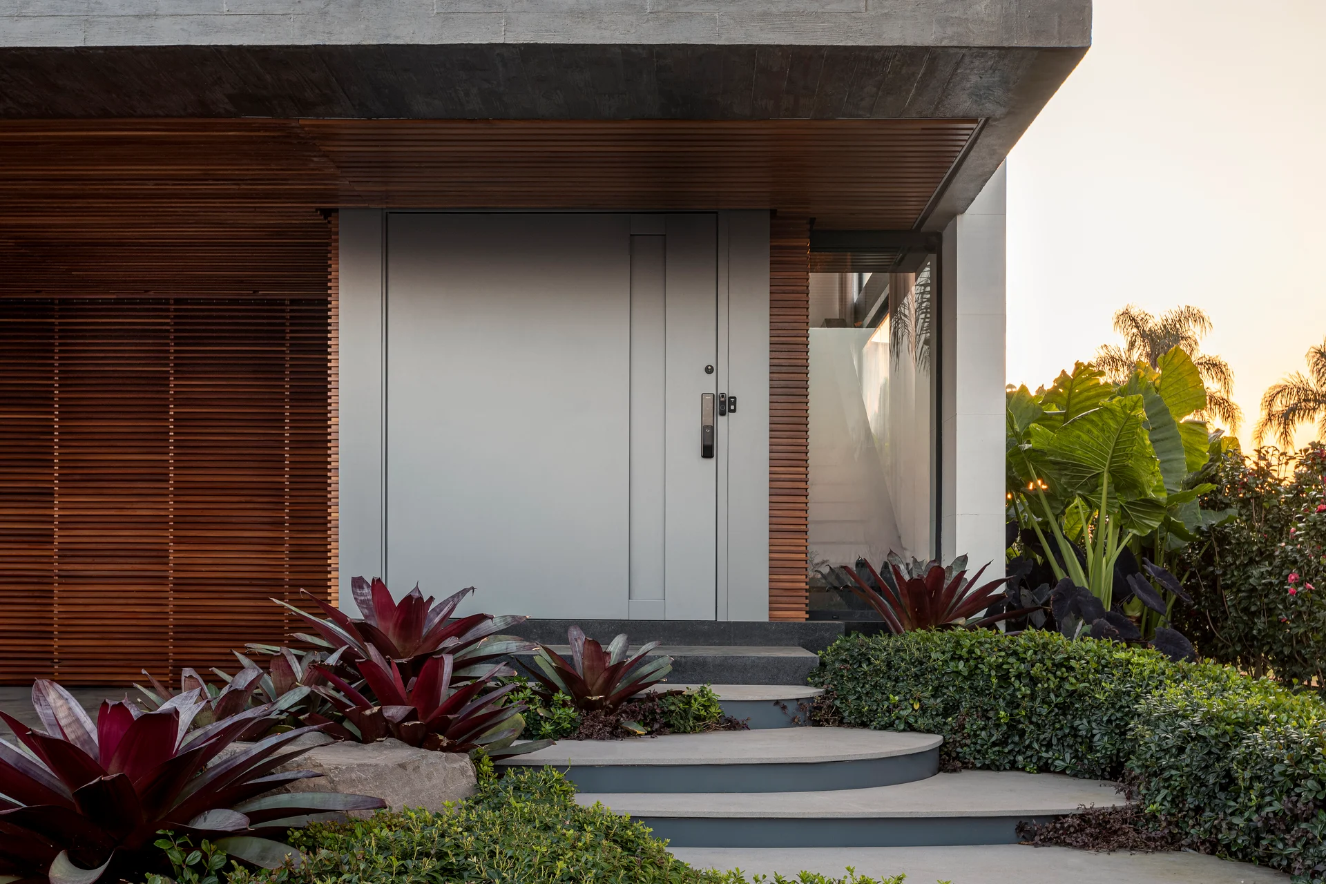 Portas maiores tornam a entrada o ponto focal da fachada, criando presença marcante e sofisticação arquitetônica.